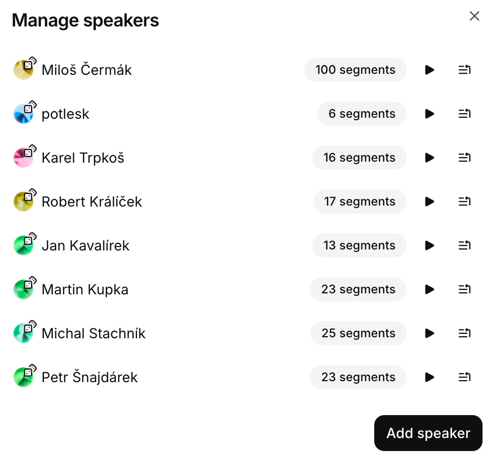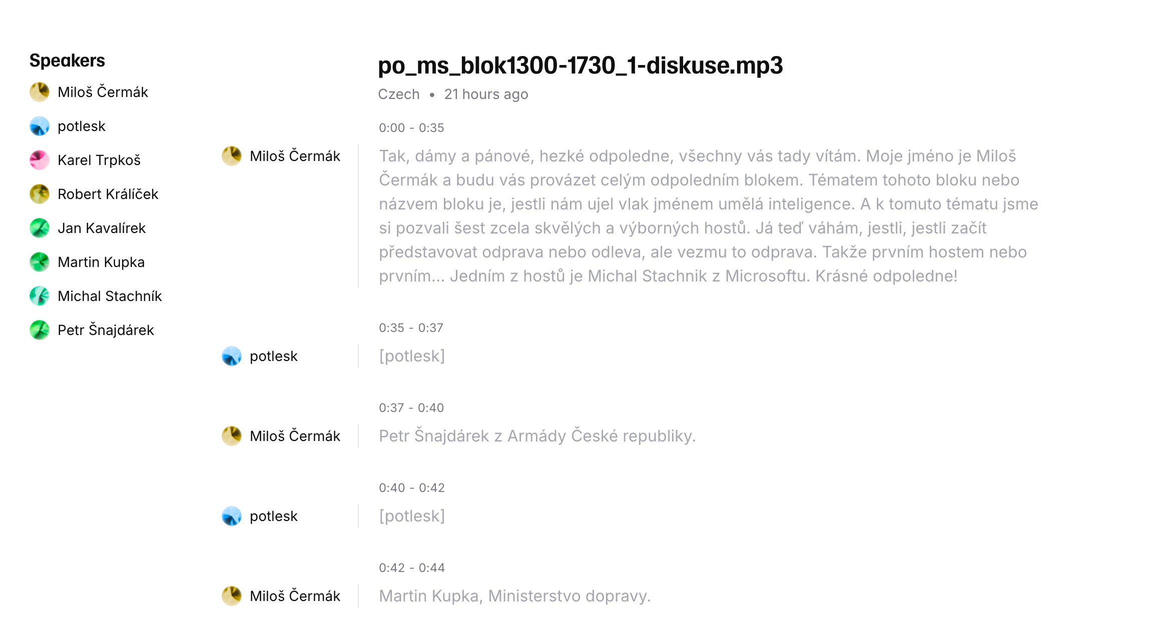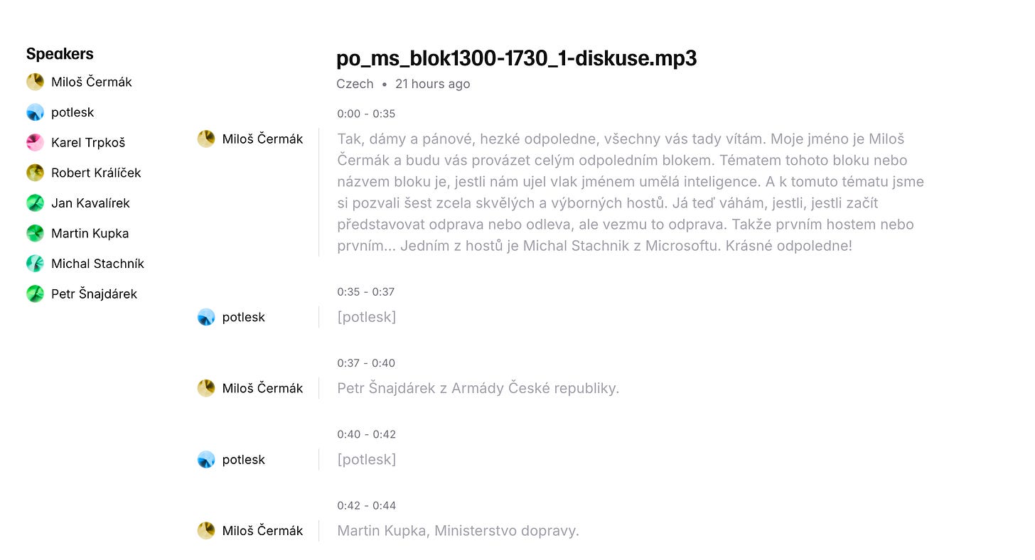 Text lze v případě potřeby “ručně” editovat, stejně tak řečníky. Když se sejdou dva lidé s podobnými hlasy, může se stát, že je model bude rozpoznávat s nějakou chybovostí. Ale stává se to z mé zkušenosti naprosto výjimečně.