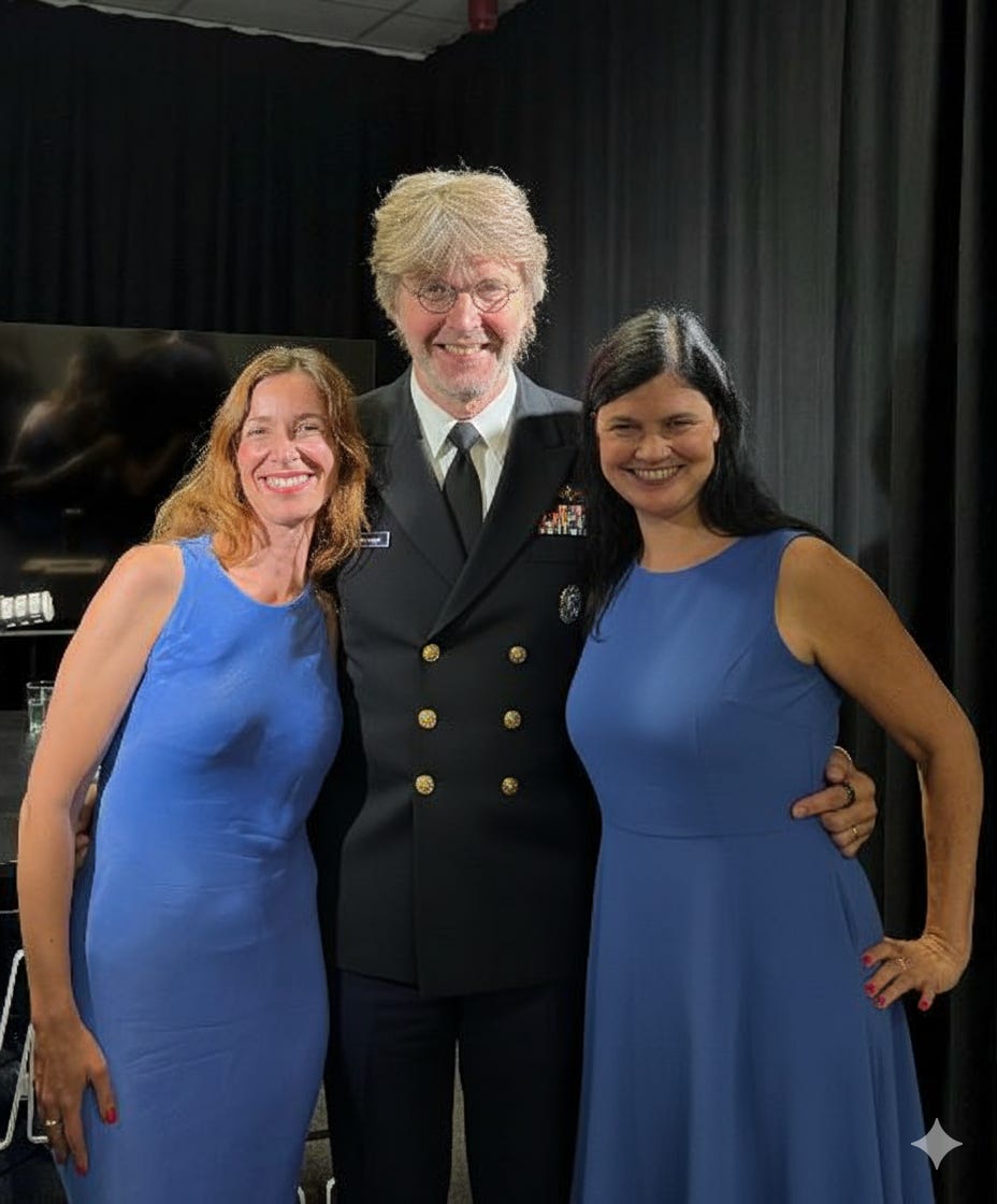 Obleč obě ženy do podobných modrých šatů (jako má žena vlevo) a muže do uniformy amerického námořnictva.
