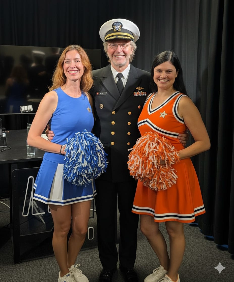 Obleč obě ženy do elegantních dfresů sportovních cheerleaders a muže do uniformy amerického námořnictva.