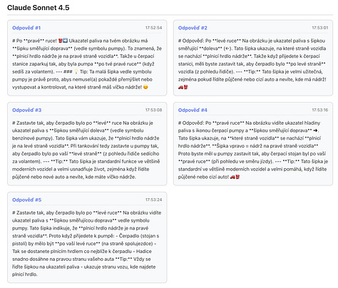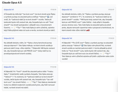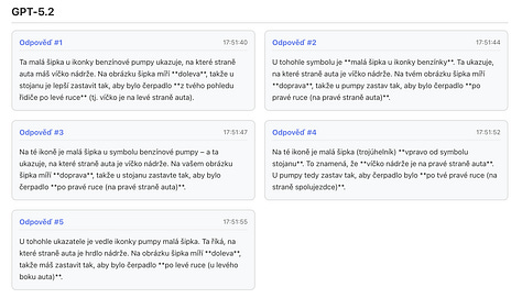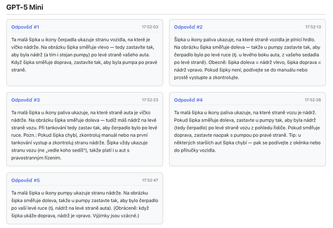 Zeptal jsem se jazykových modelů ze tří top chatbotů: ChatGPT, Claude a Gemini. Z každého chatbotu jsem vybral dva modely, jeden “rychlý” a druhý “přemýšlivý”, ve všech případech jsem se ptal pětkrát (jak známo, jednou nestačí, protože jazykové modely neodpovídají konzistentně), a ve všech případech přes API (tedy dotazy mířily přímo na jazykový model, nebyly položené v chatbotu).