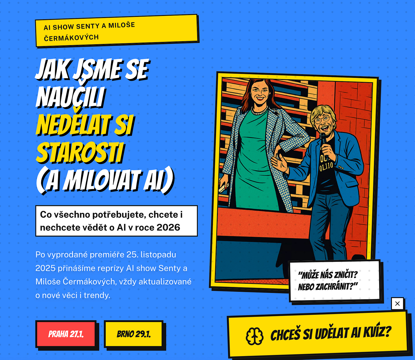 Zajímá vás AI, ale bojíte se na některé věci zeptat? Přijďte na některý z našich workshopů Masterclass AI. Anebo na naši AI show, kterou uvádíme 27. ledna od 19:00 v Praze v Kině Atlas a 29. ledna od 18:00 v Brně v ImpactHubu. Těšíme se na vás!!