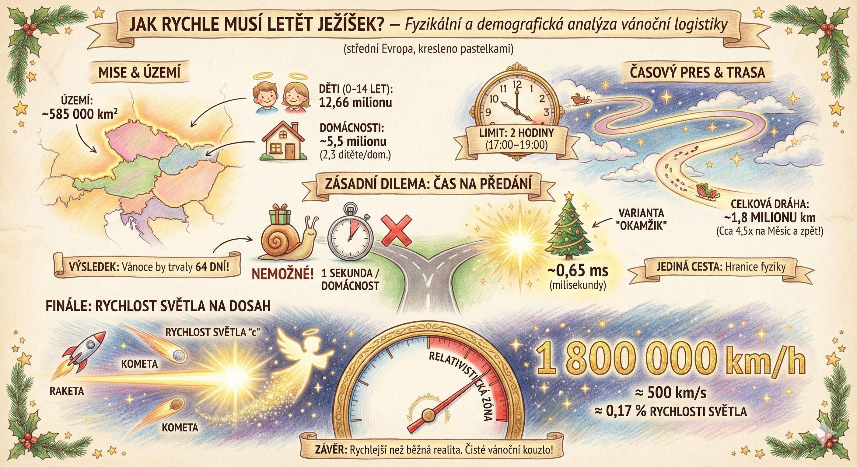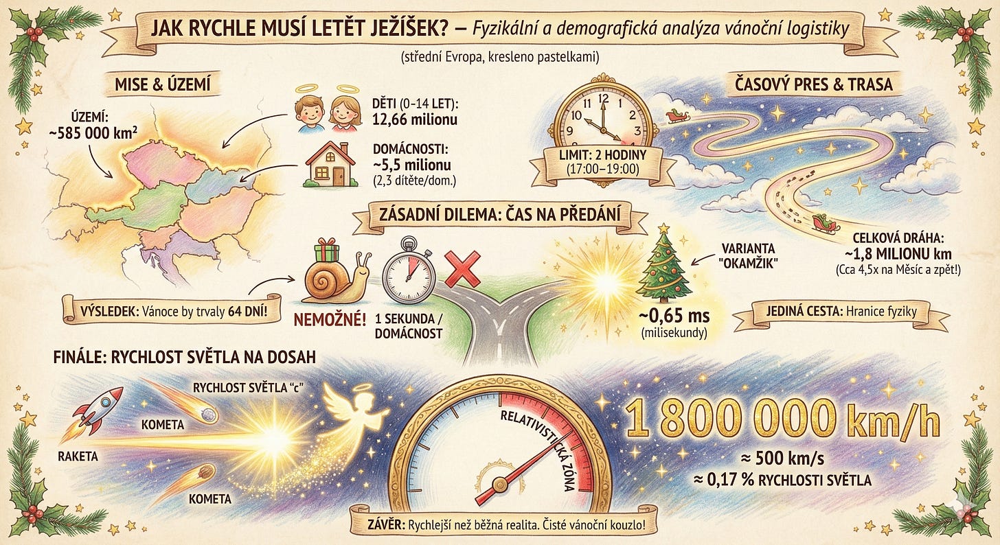 Většina z nás si představuje Ježíška lidsky. Přiletí, položí dárky, možná spiklenecky mrkne na rodiče, nadechne se, letí dál. Řekněme, že mu to trvá jednu sekundu. Jednu jedinou sekundu na domácnost. Zní to jako fofr, že? Jenže matematika je neúprosná. Pokud by Ježíšek věnoval každé domácnosti jednu sekundu, trvalo by doručování dárků přesně 5 504 348 sekund.